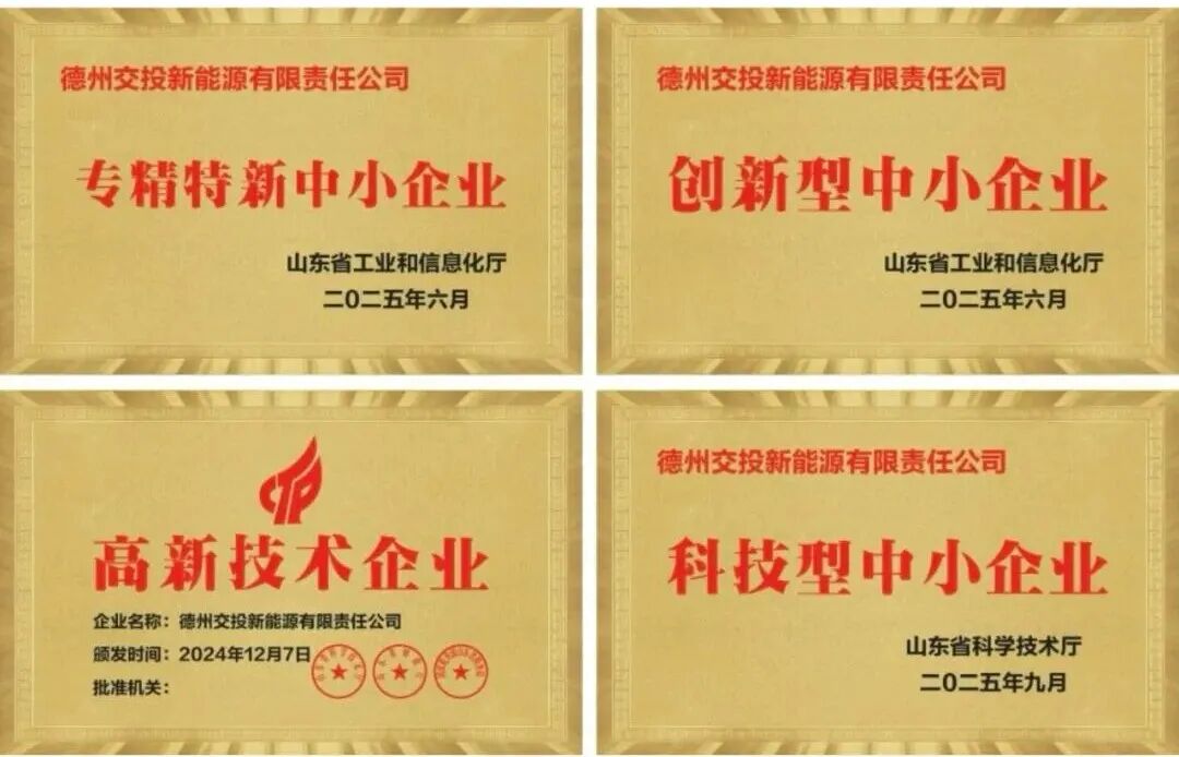 交投新能源公司始终坚守创新驱动发展理念,深耕科技研发,积极参编多项国家及地方行业标准,斩获多项专利与荣誉资质,先后获评高新技术企业、创新型中小企业、专精特新企业、科技型中小企业,让技术创新成为企业高质量发展的强劲引擎。